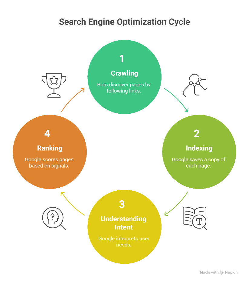 Ranking. Google scores every indexed page across 200+ signals including content depth, page speed, backlinks, and user experience.